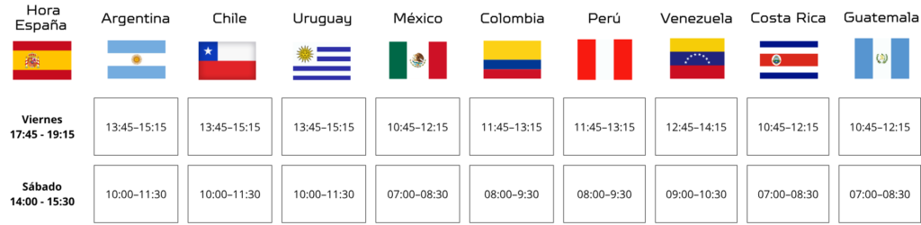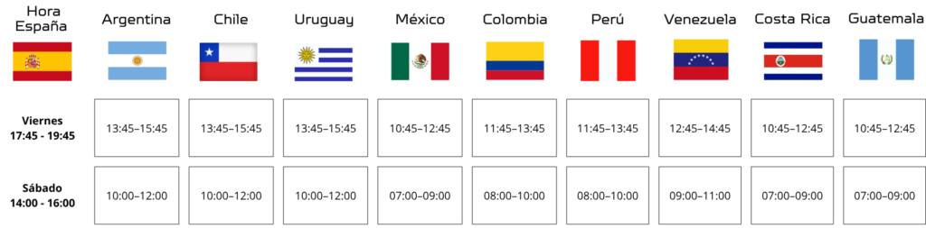 Aquí se muestran dos tablas de conversión horaria para los países latinoamericanos donde poder consultar la hora respecto a la de España.